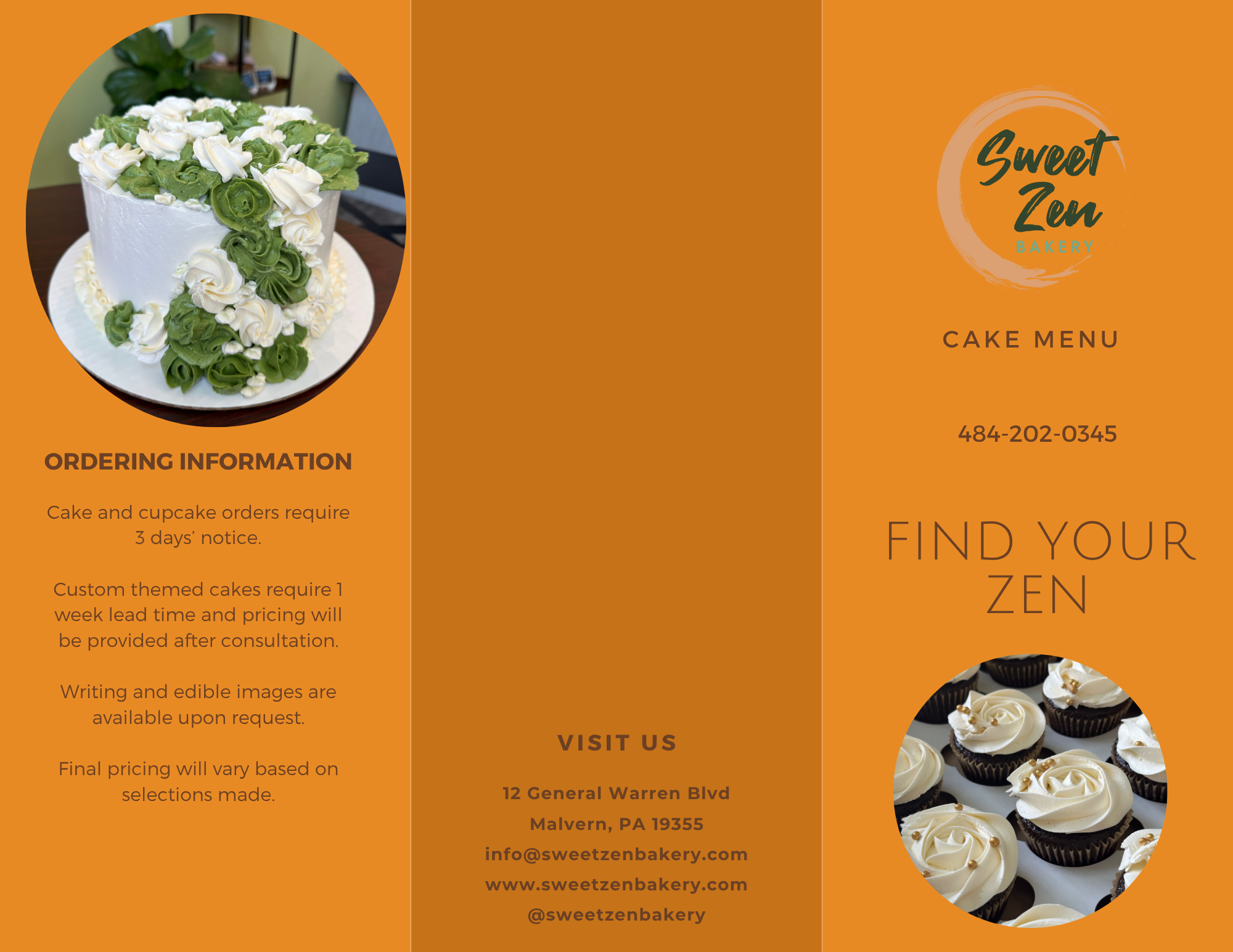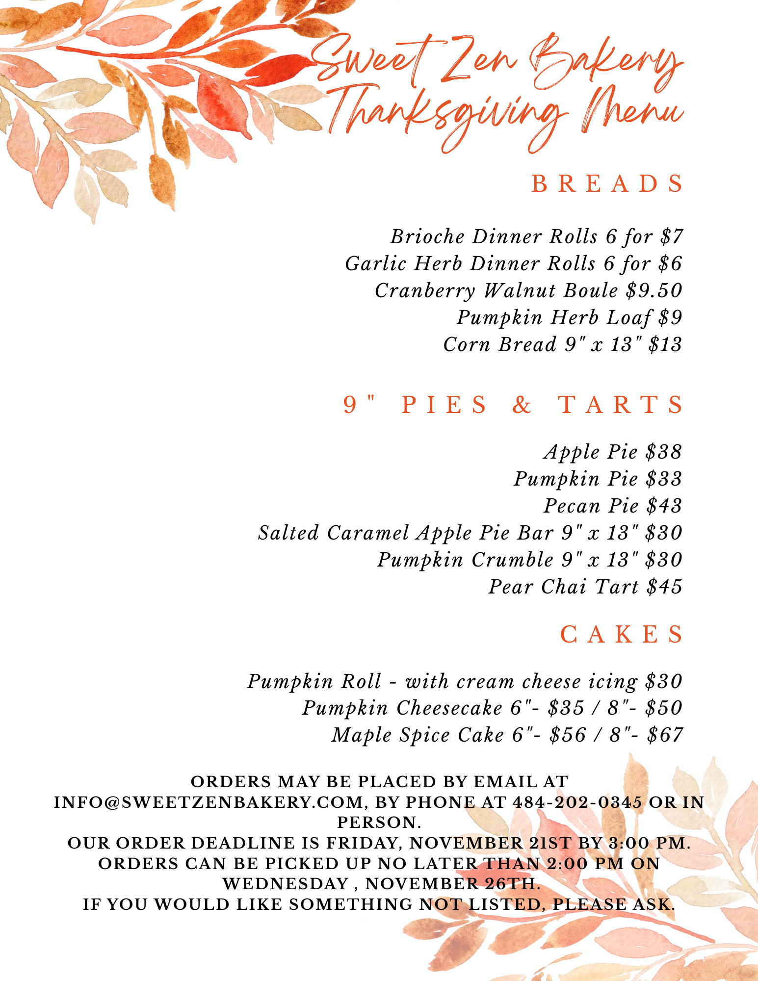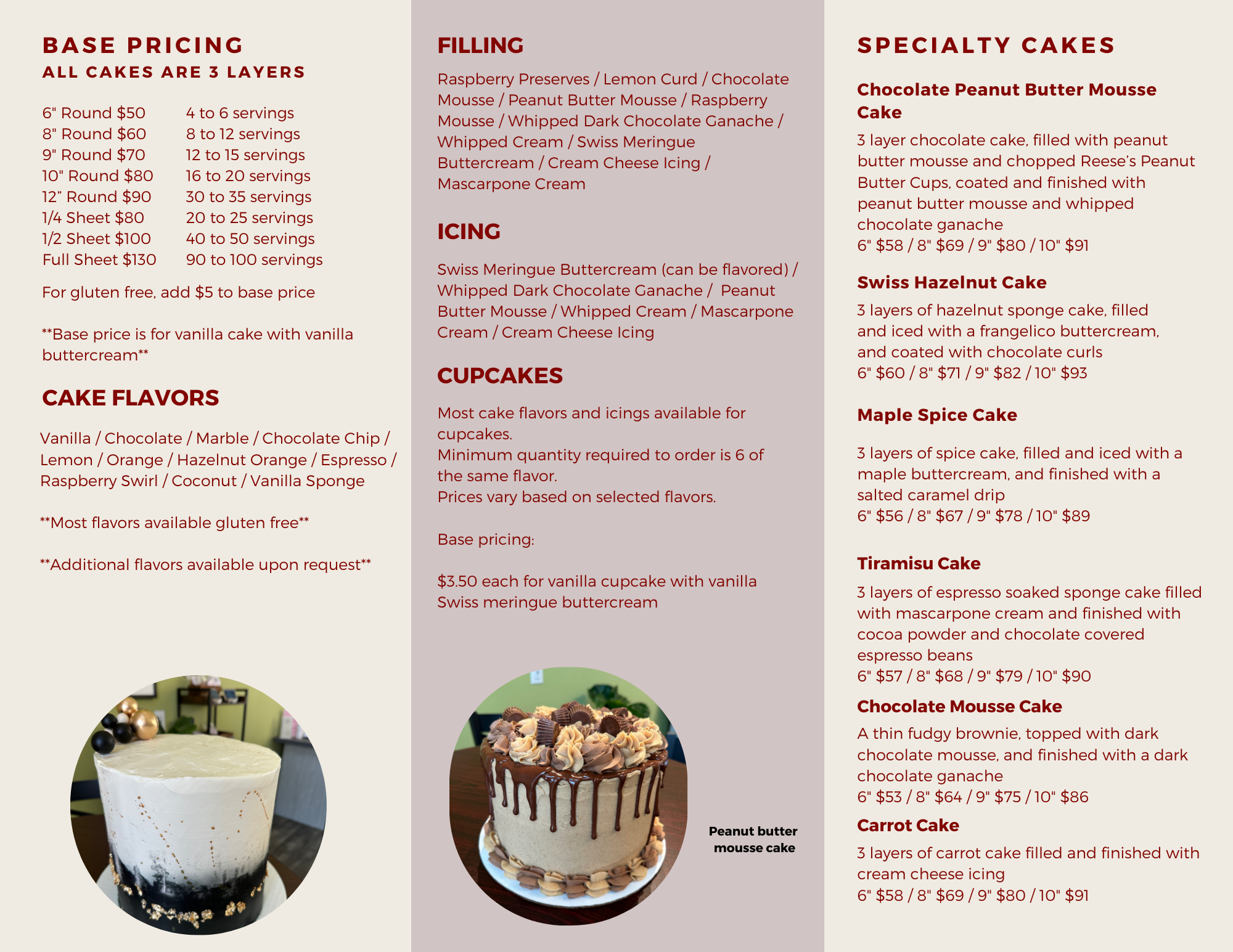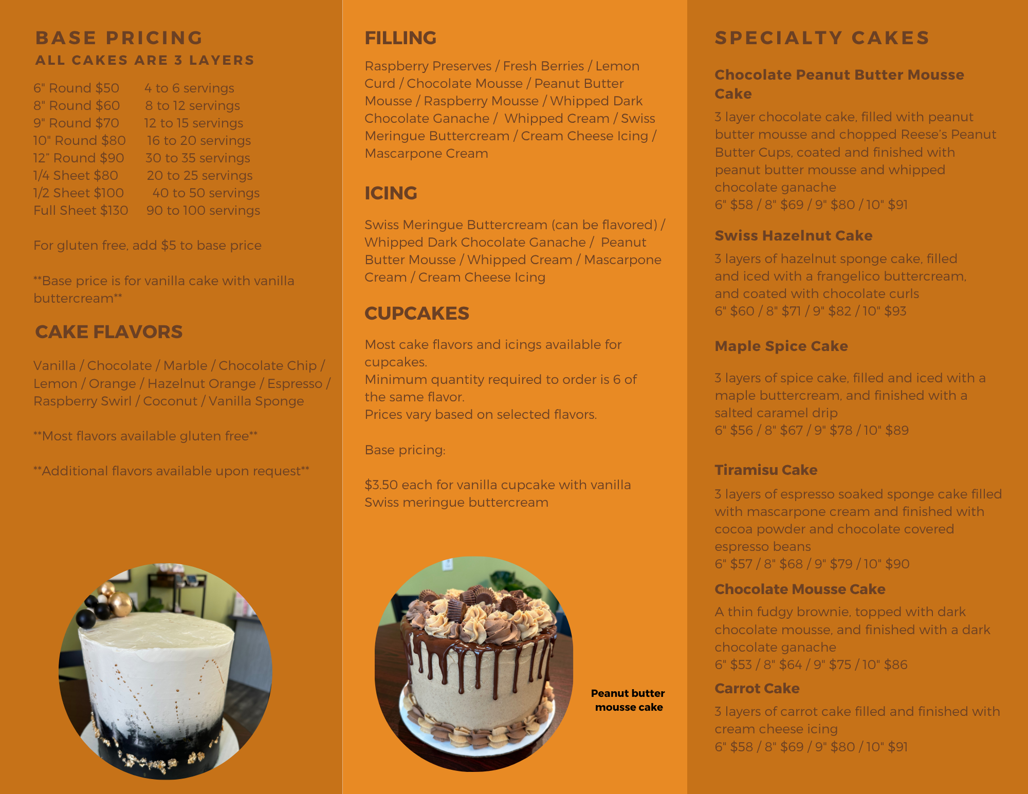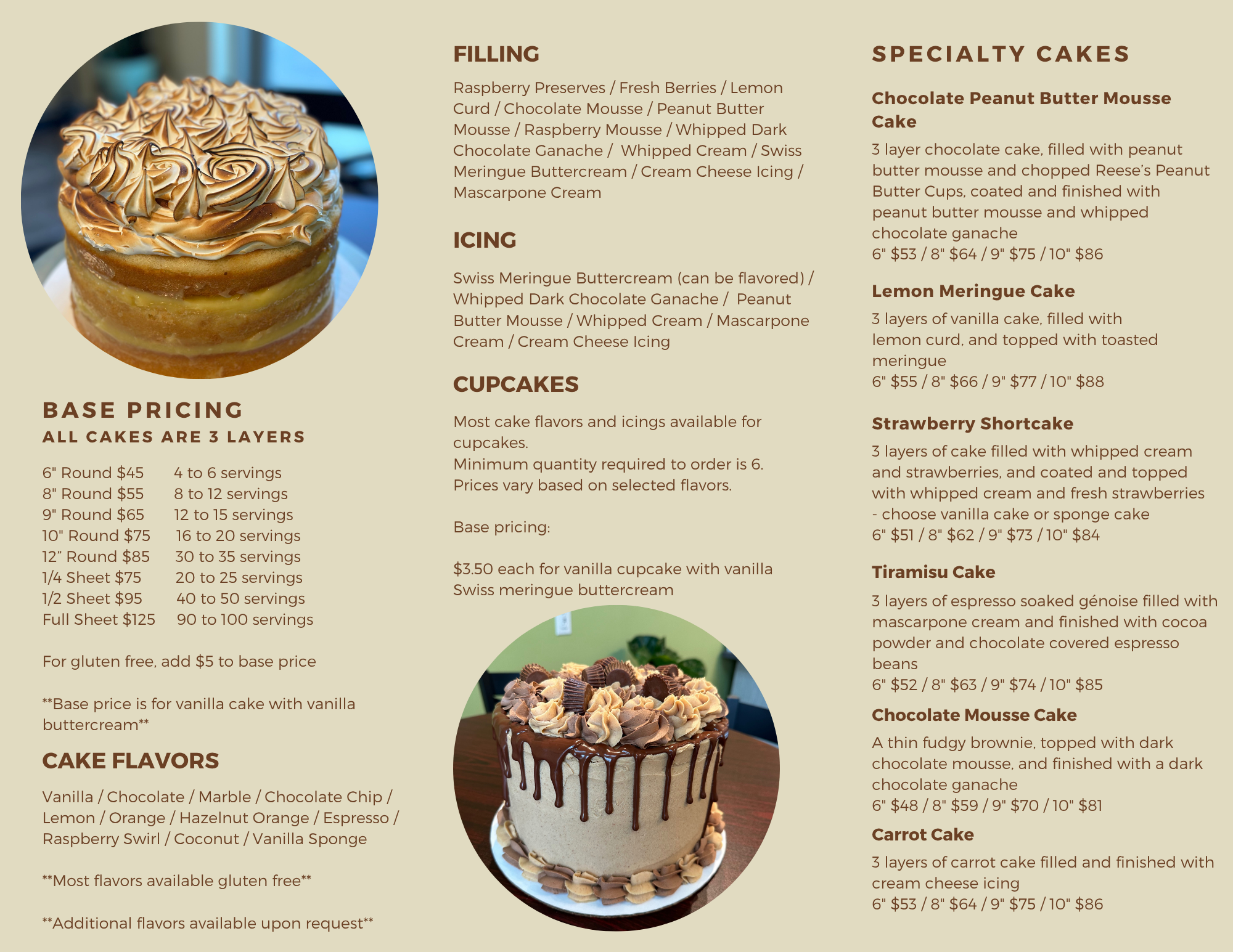 All our products are made in small batches to ensure freshness. Although we do not have ready to go whole cakes, we do at times have individual portions of different cakes available. Cakes can be ordered and can always be customized. Please see our cake menu below. Anything found in the store can be ordered as well if you’re looking for larger quantities than what we have on hand - even our breads!